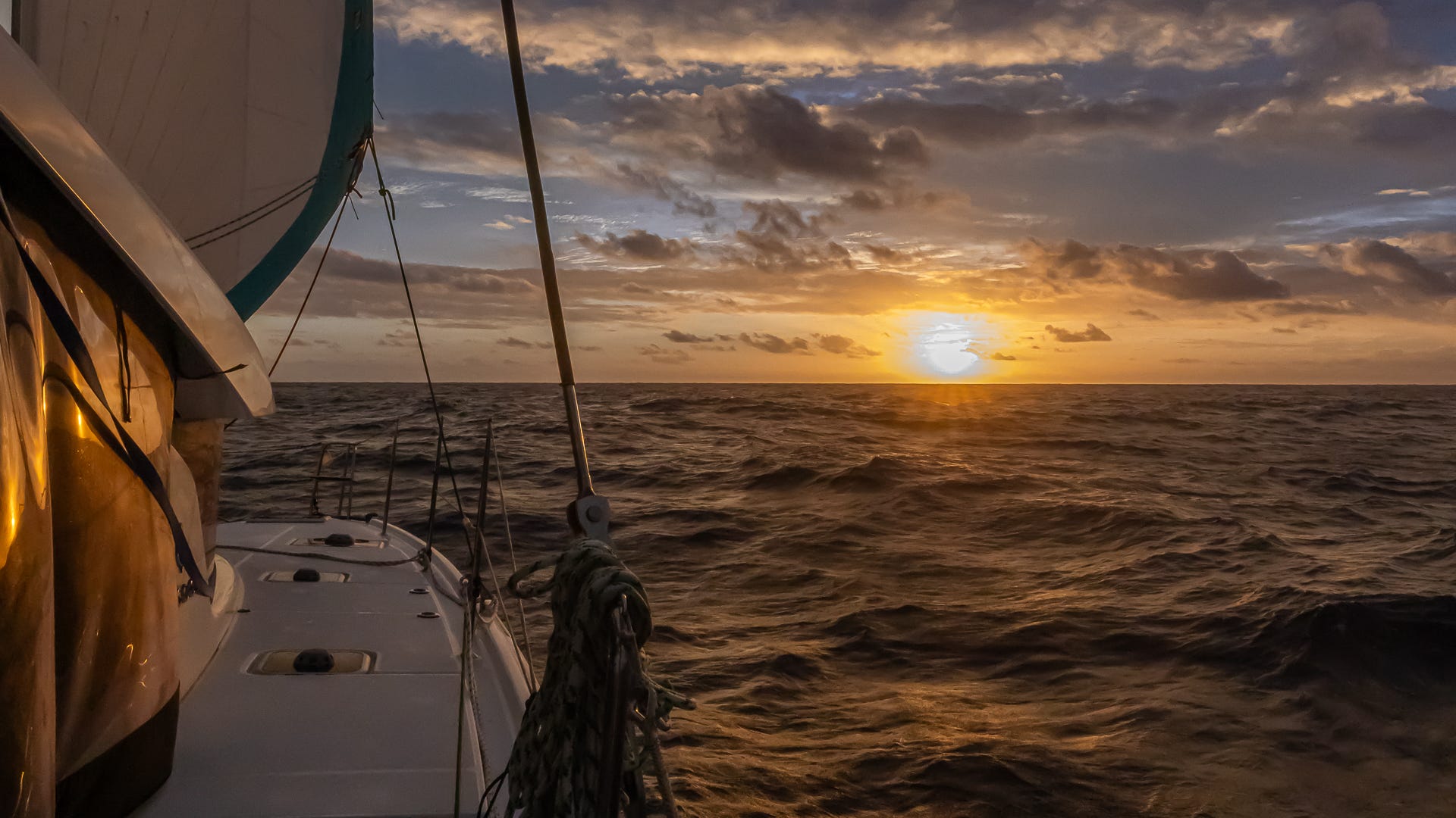At sea, there is no place to stop. No rest stops, no hotels, no dirt road to pull onto and wait till morning. When the sun sets, we keep on sailing. There is always someone on. At 2:45 am, my alarm goes off. It’s time for my 3-6 shift. I look up and see my wife at the helm, eager for her break. I turn on the red headlamp and search for my jacket and PFD. I fill my pockets with all I need: headphones, cookies, a Kindle, and my phone. At 2:55, I report for duty. The change is mechanical and efficient: wind speed, wind angle, heading, islands and reefs, boats, storms, sea state. She leaves the helm for the comfort of the saloon couch. I sit and stare at the red-lit instrument panel, still too sleepy to make sense of it. Slowly, I settle. I watch the radar and see nothing. I check the wind angle and speed, and tweak the jib trim for no reason at all. Habits. Without the moon, there is nothing out there. Just darkness. Maybe the white caps of the waves when they break on our beam. Maybe a bird flies by close enough to startle me. Mostly, it’s emptiness until I look up and see a million stars. I’m equally awestruck and terrified. Each one reminding me of the insignificance of it all. And then the wind picks up. I reef the sails and put the hood of my jacket on. Chaos everywhere. Wind humming, rig grunting, fiberglass creaking, waves crashing. I hold on to the side of the seat as the boat climbs and falls through the building swell. Soon after, fear gives way to acceptance, and on a good day, excitement. On those days, I put the headphones on and press play. The music drowns out the chaos. A voice sings about small towns and little sun. The noise disappears. It feels magical, a calmness divorced from the chaos around me. The boat rises above the wave. It accelerates at the crest. I brace for the drop, but it never comes. We keep going, faster and faster, surfing on its crest. We are gliding, flying, like a foiling dinghy on a lake. But we are no dinghy. We are a house riding the waves of the Pacific.