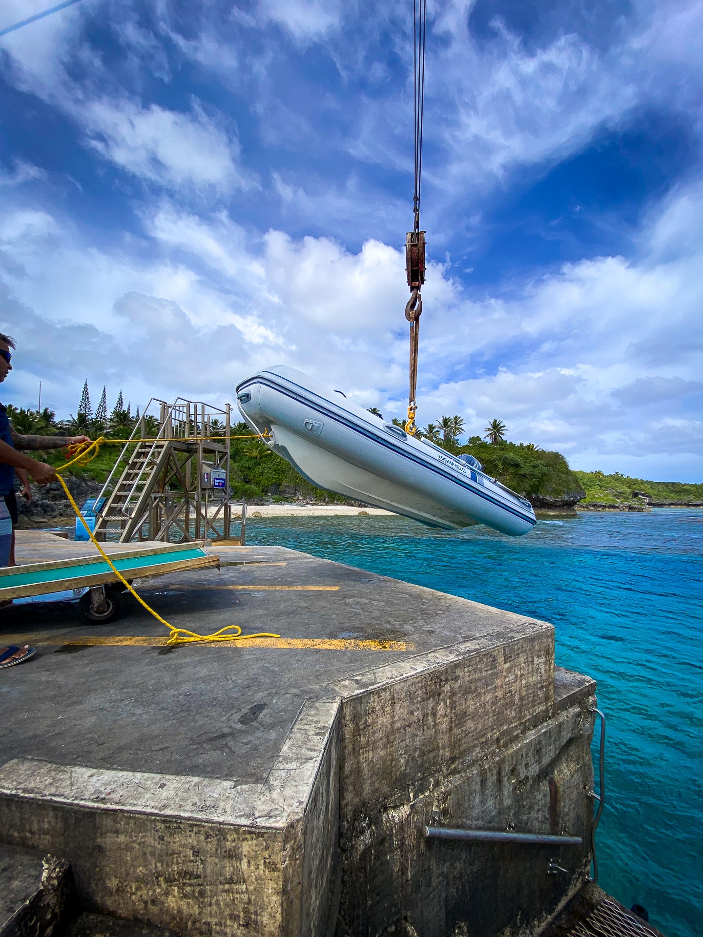 “Niue Radio, Niue Radio, Niue Radio. This is sailing vessel Blue Buddha,” we called on Channel 16 and asked permission to stop. Before sunset, we tied to a mooring buoy next to a couple of sailboats and stared at the town above the cliff. A steep road led to the only dock. It was not a traditional pier supported by columns that let the ocean move freely below it. It was a solid block of concrete rising vertically twenty feet above the crashing swell. No boats were tied to it; instead, they were lying above on the dock, like someone had plucked them from the ocean and put them safely on shore. And then we saw it. A dinghy from another boat was floating in the air, being lifted from the water by a crane. It was the only path from the sea to the land above.