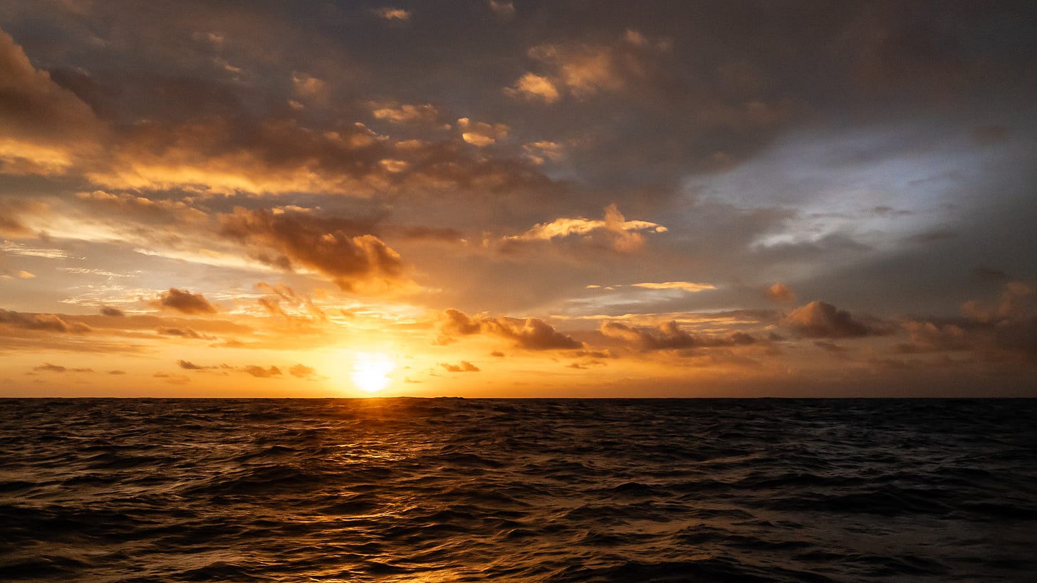 At sea, our lives exist within the confines of this boat. After the initial shock, after the cacophony of sounds fades into white noise and the rolls and shakes become part of our own motion, our lives move on. We cook and eat. We work, read, sleep, watch TV, play card games, and stare at the sunsets and stars. We change sails, make fresh water, run the engines, and plot our location on a paper chart. Day after day, week after week, we travel west with everything we own on our floating home.